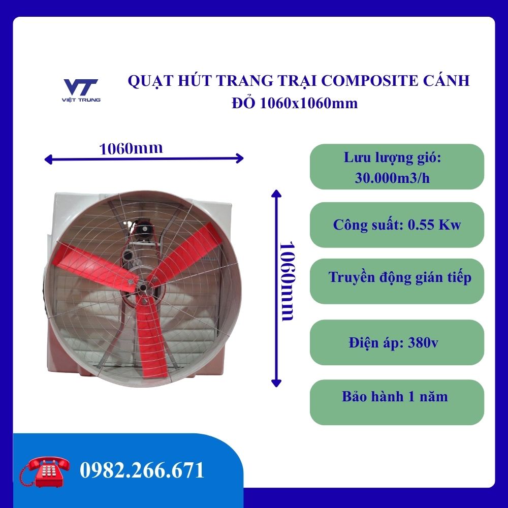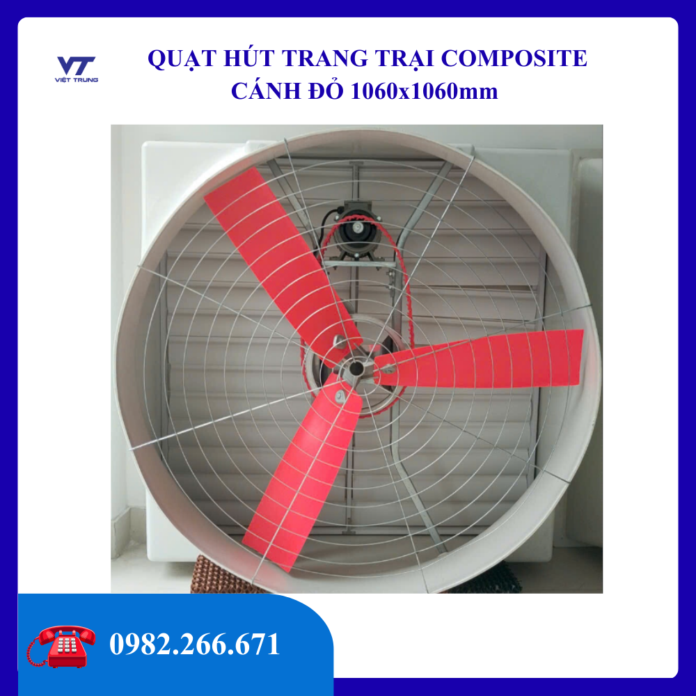 📞 Liên hệ ngay Công ty TNHH Thiết bị Chăn nuôi Việt Trung – 0982266671 để được tư vấn chi tiết và đặt hàng QUẠT HÚT TRANG TRẠI COMPOSITE CÁNH ĐỎ 1060X1060mm chính hãng!