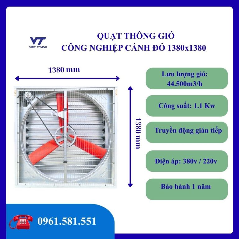 Nếu bạn đang cần trang bị hệ thống thông gió hiệu quả, hãy liên hệ ngay cho chúng tôi. Việt Trung cam kết cung cấp sản phẩm chính hãng, giao hàng tận nơi và bảo hành chu đáo. Đầu tư quạt thông gió công nghiệp cánh đỏ 1380×1380 chính là giải pháp dài hạn giúp tối ưu môi trường làm việc và nâng cao hiệu suất vận hành.